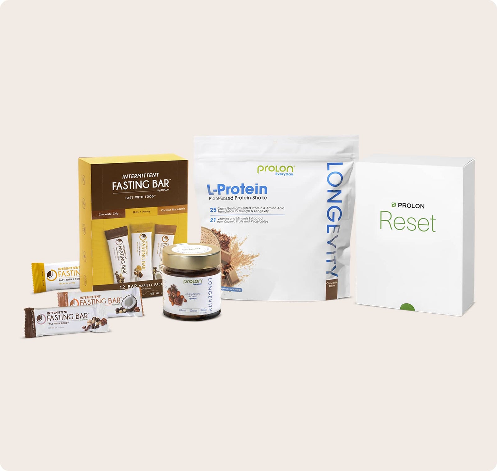 Includes: Fasting Bars (12 bars), L-Protein (12-shakes), 1-Day Reset (1 Kit), L-Spread (1 jar).